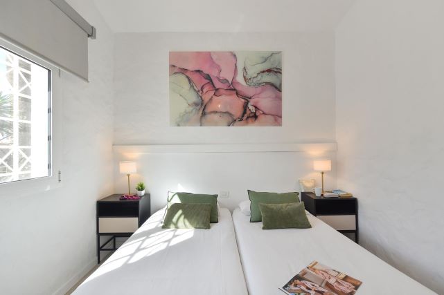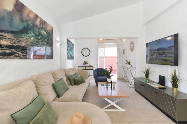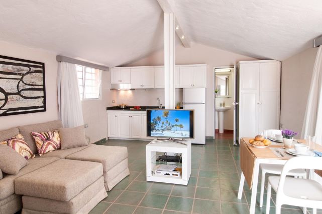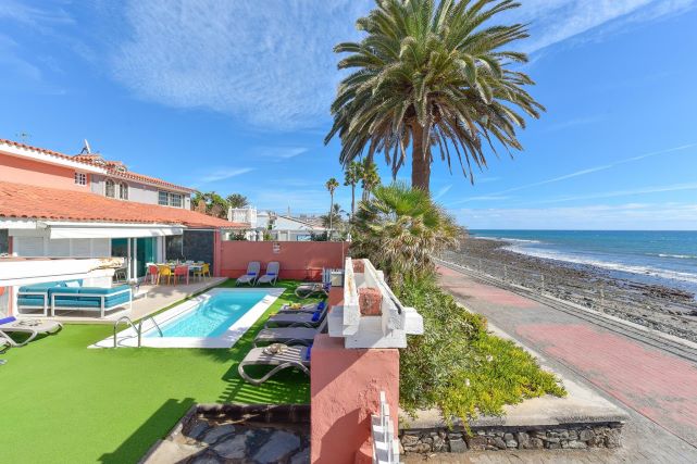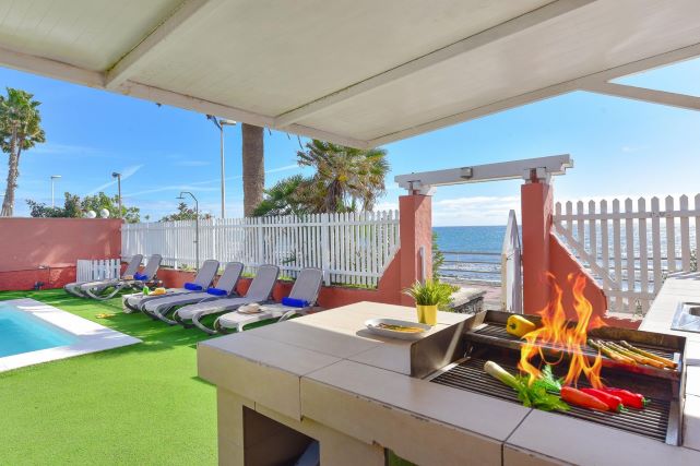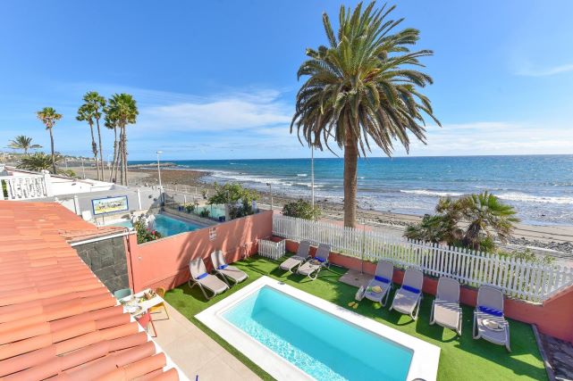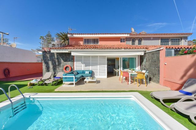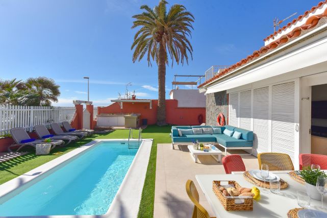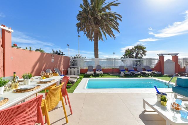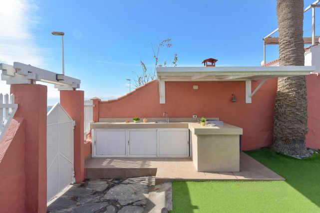 Vanuit de woonkamer kunt u via de openslaande deuren naar het terras. Het terras is voorzien van een zonnescherm zodat u in de schaduw kunt relaxen en eten. Op het gras staan een aantal ligbedden om heerlijk te genieten van de Canarische warmte. Daarnaast heeft u natuurlijk de beschikking over een privé zwembad (4,50m x 2m) en buitendouche. Heerlijk in de ochtend een verfrissende duik neme!. Voor het diner kunt u gebruik maken van de barbecue en de buitenkeuken: genieten tijdens de ondergaande zon.