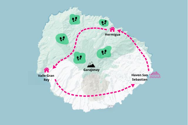 U komt aan op de luchthaven van Tenerife Zuid, waar een taxi u naar de haven van Los Cristianos brengt. Vanuit hier vaart u in ongeveer vijftig minuten met de ferry naar La Gomera. In San Sebastián staat uw huurauto klaar en rijdt u in een half uur naar de regio Hermigua of Vallehermoso, waar uw hotel ligt.