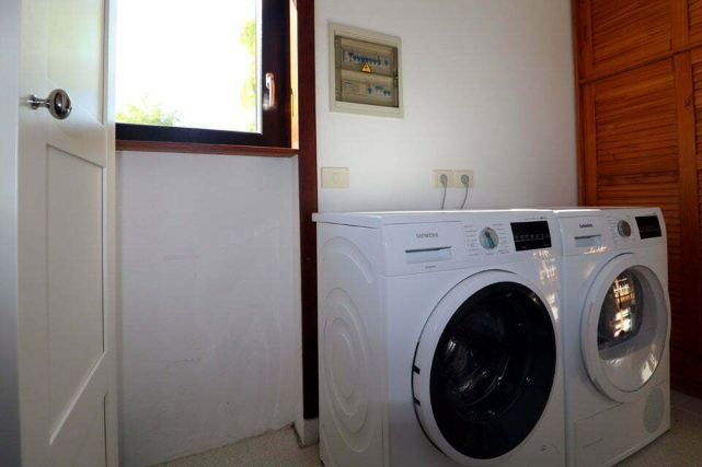 Verder vindt u op de begane grond een ruime badkamer met een bad-/douchecombinatie, wastafel met spiegelkast, toilet en bidet. In de bijkeuken staan een wasmachine en droger en zijn ook een droogrek, strijkijzer en strijkfaciliteiten aanwezig.