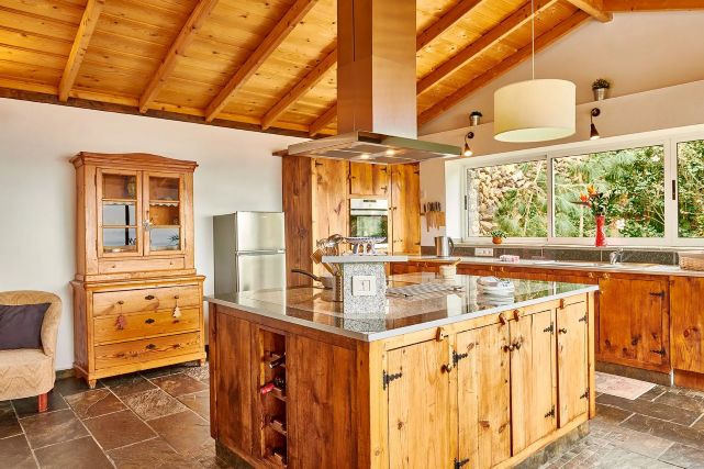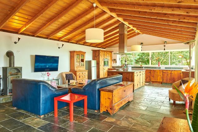Via de entree komt u binnen in een royale leefruimte waar alles mooi in elkaar overloopt. Links bevindt zich de sfeervolle zithoek met comfortabele banken, televisie, wifi en een houtkachel die zorgt voor extra warmte en gezelligheid. De hoge houten plafonds en grote ramen geven de ruimte een open en licht karakter. Aansluitend vindt u de eethoek, een fijne plek om samen te tafelen met uitzicht naar buiten. Rechts bevindt zich de robuuste houten keuken met een groot kookeiland. De keuken is voorzien van onder andere een kookplaat, oven, koelkast met vriesvak, vaatwasser, koffiezetapparaat en waterkoker. Daarnaast is er een wasmachine aanwezig, wat het verblijf extra comfortabel maakt, zeker bij een langer verblijf.