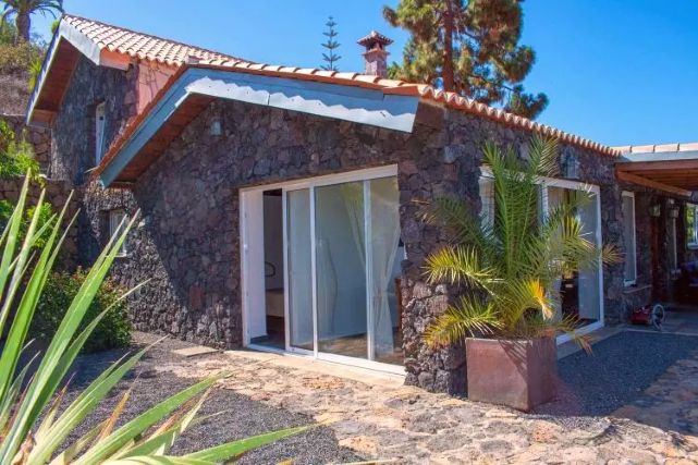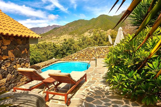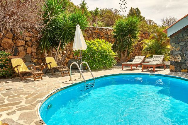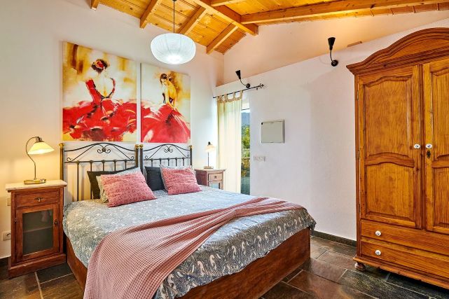 Vanuit deze slaapkamer heeft u direct toegang tot het terras achter het huis en het knusse ronde privé zwembad, een fijne plek om af te koelen en te genieten van de rust en privacy. Het zwembad is ook bereikbaar via een buitentrap met ongeveer vijftien treden, waardoor de verschillende niveaus van de villa op een natuurlijke manier met elkaar verbonden zijn.