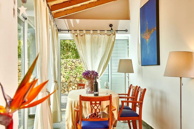 Villa Cabana (max. vier personen) is een ruime villa van 130 m², verdeeld over twee verdiepingen, met een warme en authentieke uitstraling. U bereikt de villa via een lange, licht oplopende oprit, wat meteen zorgt voor een gevoel van rust en privacy bij aankomst. Aan de voorzijde van de villa vindt u een overdekt terras met een comfortabel loungezitje en een eettafel met stoelen. Hier geniet u van een prachtig uitzicht en is het heerlijk vertoeven, van een ontspannen ontbijt tot lange avonden buiten.