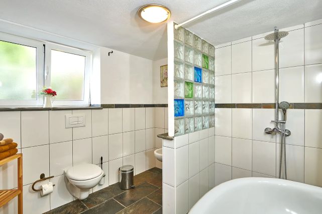 Op de bovenverdieping vindt u de tweede slaapkamer, eveneens ingericht met twee eenpersoonsbedden die zijn opgemaakt als tweepersoonsbed en een kledingkast. De eigen badkamer beschikt over een wastafel, toilet en douche.