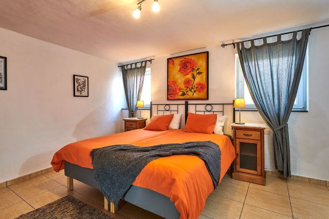 De villa beschikt over twee slaapkamers. Eén slaapkamer heeft een authentieke uitstraling met mooie elementen zoals natuurstenen muren en een warme, karaktervolle sfeer. Deze slaapkamer is ingericht met twee eenpersoonsbedden die zijn opgemaakt als een tweepersoonsbed, een kledingkast en een zitbank. De tweede slaapkamer is ruim en praktisch ingericht en beschikt over twee eenpersoonsbedden en een kledingkast.