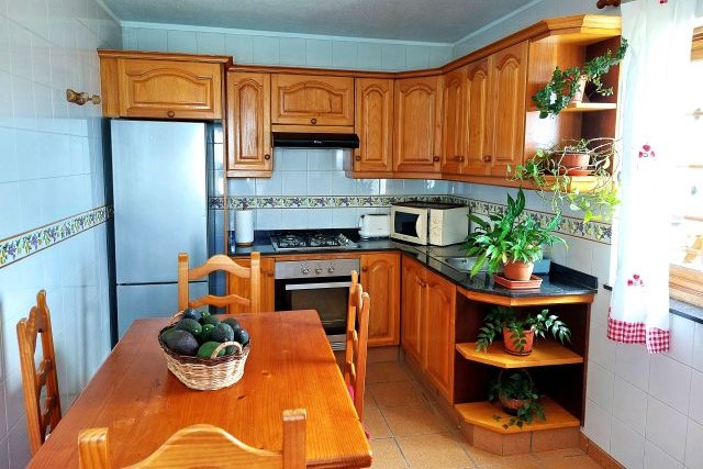 De woonkamer is licht en sfeervol ingericht met comfortabele zithoek, satelliet-tv, stereo-installatie, wifi en een open haard voor de koelere avonden. De keuken met eethoek is uitgerust met een gasfornuis met vier pitten, afzuigkap, magnetron, koelkast, broodrooster, tostie-apparaat, citruspers, blender en waterkoker. Ook een wasmachine, wasrek, strijkplank en strijkijzer zijn aanwezig, zodat het huis van alle praktische gemakken is voorzien.