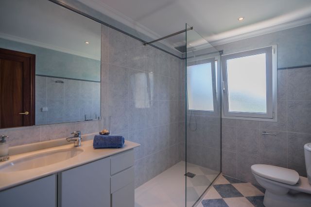 De villa beschikt over vier slaapkamers. Op de begane grond bevindt zich een tweepersoonsslaapkamer met een bed van 1,50 x 2,10 meter en directe toegang tot het terras. Aangrenzend vindt u een badkamer met douche, wastafel, toilet en een föhn. Op de eerste verdieping zijn er twee tweepersoonsslaapkamers (bedden 1,50 x 2,00 en 1,35 x 2,00 meter) en een slaapkamer met twee eenpersoonsbedden (0,90 x 2,00 meter). Er zijn twee badkamers op deze verdieping, waarvan één en suite, beide met douche, wastafel en toilet. Daarnaast is er een extra gastentoilet op de begane grond. Op de eerste verdieping is bovendien airconditioning aanwezig in de hal voor de slaapkamers.