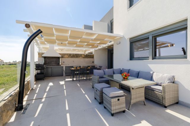 De villa beschikt over drie slaapkamers, elk ingericht met een tweepersoonsbed en voorzien van airconditioning, een televisie en kastruimte. Op de begane grond vindt u één slaapkamer met directe toegang tot de tuin. Deze kamer heeft een ensuite badkamer met wastafel, toilet, föhn en een wat compactere douche. Op de bovenverdieping liggen de andere twee slaapkamers. Eén daarvan heeft via een schuifdeur toegang tot het balkon.