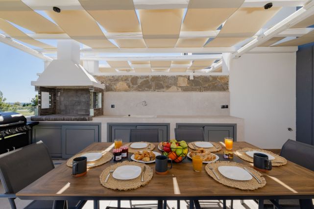 Buiten is het heerlijk verblijven. Het privé zwembad ligt centraal in de tuin en wordt omringd door ligbedden en diverse zitplekken. In het zwembad is een bubbelbank verwerkt met masserende bubbels, ideaal voor een ontspannen moment. Bij de buitenkeuken met barbecue en de eethoek geniet u van lange avonden in de open lucht. Voor wat extra vermaak is er een tafeltennistafel aanwezig. Parkeren kan eenvoudig op eigen terrein bij de villa.