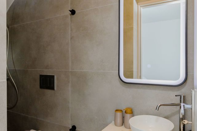 Er zijn in totaal drie badkamers aanwezig. Naast de badkamer beneden zijn er boven nog twee badkamers, beide uitgerust met een wastafel, toilet en douche.
