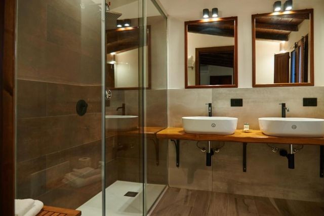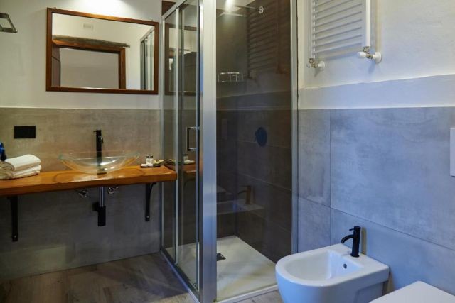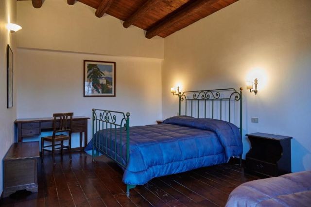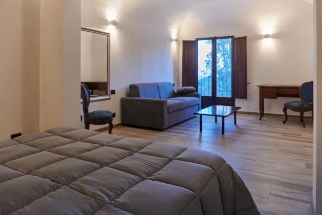 De kamer is voorzien van airconditioning, verwarming en een kledingkast. De marmeren vloer geeft de kamer een frisse, mediterrane uitstraling en sluit mooi aan bij de authentieke sfeer van het landgoed. De badkamer is uitgerust met een douche, toilet, bidet, föhn en gratis toiletartikelen.