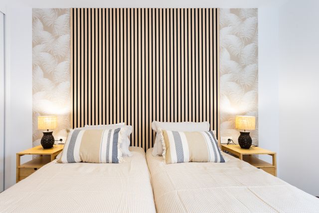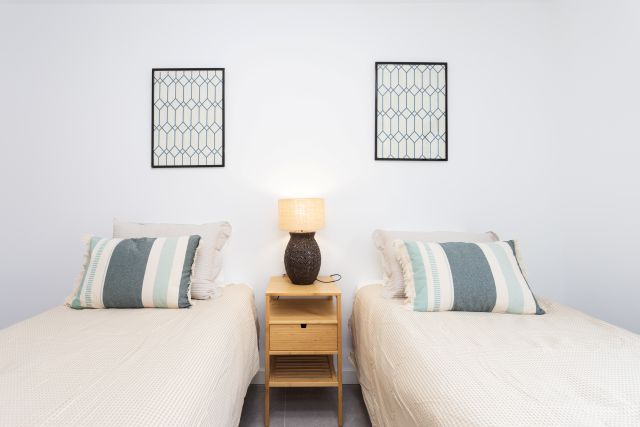 Het appartement beschikt over twee slaapkamers: in de eerste staan twee eenpersoonsbedden die aan elkaar zijn geschoven en in de tweede slaapkamer staan twee losse eenpersoonsbedden. De badkamer is voorzien van douche, wastafel, toilet, föhn.