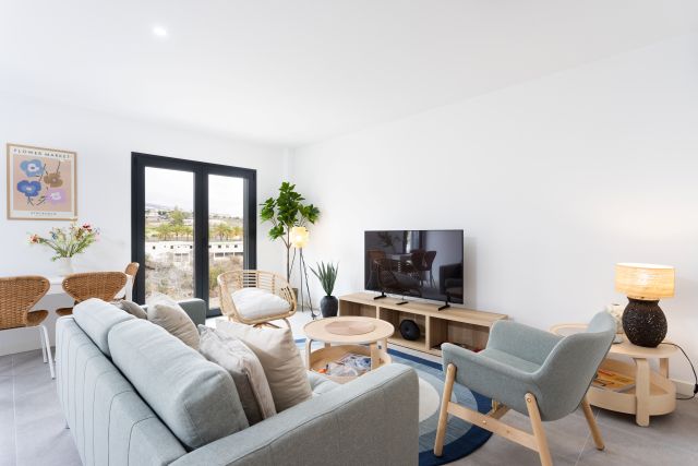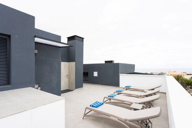 Vanuit de woonkamer brengt een trap u naar de tweede verdieping, waar u een extra toilet en het royale privé dakterras van ongeveer 70 m² vindt, een van de grootste pluspunten van dit appartement. Hier staan ligbedden, een buitendouche, een tafel met stoelen en twee hangmatten voor een ontspannen siësta. Dankzij het uitzicht is dit een heerlijke plek om van de zon te genieten of de avond gezellig buiten door te brengen.